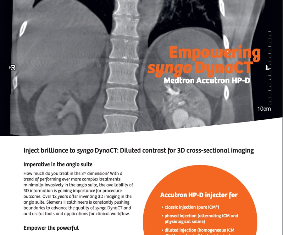 - Procedimiento de TC híbrido: En el modo CT, el Accutron® HP-D permite el uso intravenoso en procedimientos de TC híbridos en el conjunto de angiografías.