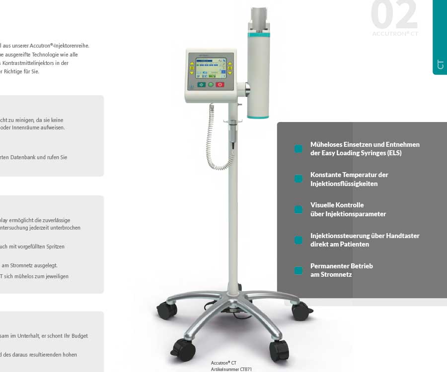 - Más comodidad para sus pacientes: La jeringa térmica integrada mantiene el medio de contraste a la temperatura corporal, lo que se traduce en una viscosidad óptima y, por tanto, en un tratamiento más agradable.