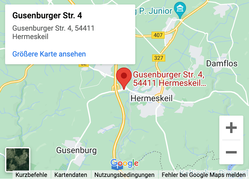 Sie erreichen unser Produktionsgebäude für Verbrauchsmaterialien über die Autobahn A1 Saarbrücken – Trier. Nehmen Sie, egal aus welcher Autobahnrichtung kommend, die Ausfahrt Hermeskeil und biegen Sie nach links in die Gusenburgerstraße ein. Unser Produktionsgebäude befindet sich ebenfalls auf der linken Straßenseite mit der Hausnummer 4.