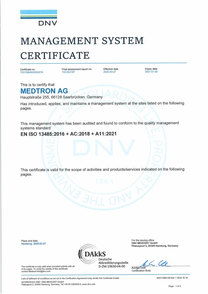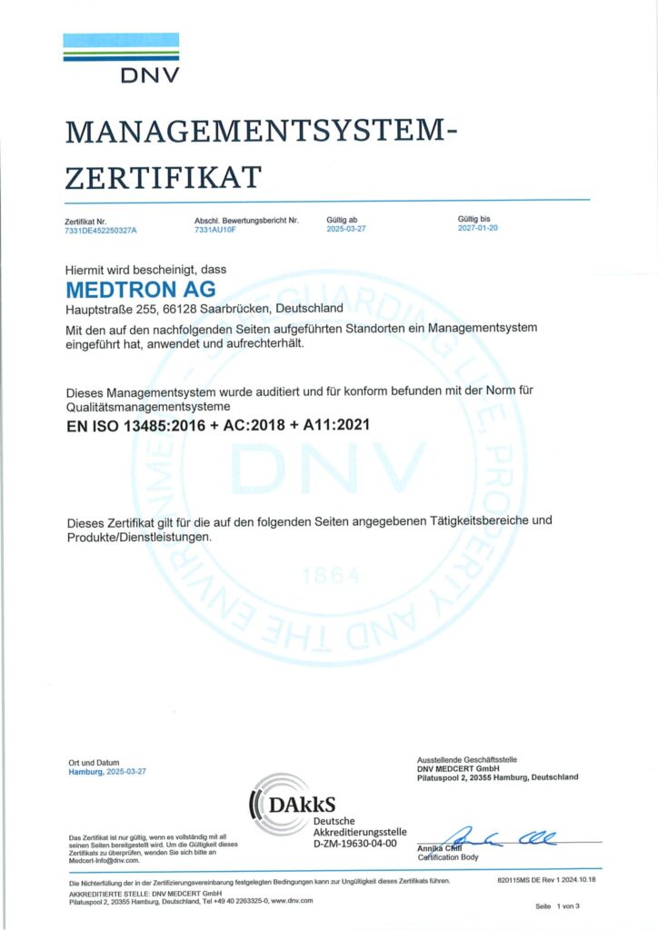 Zertifikat EN ISO 13485:2016 + AC:2018 + A11:2021