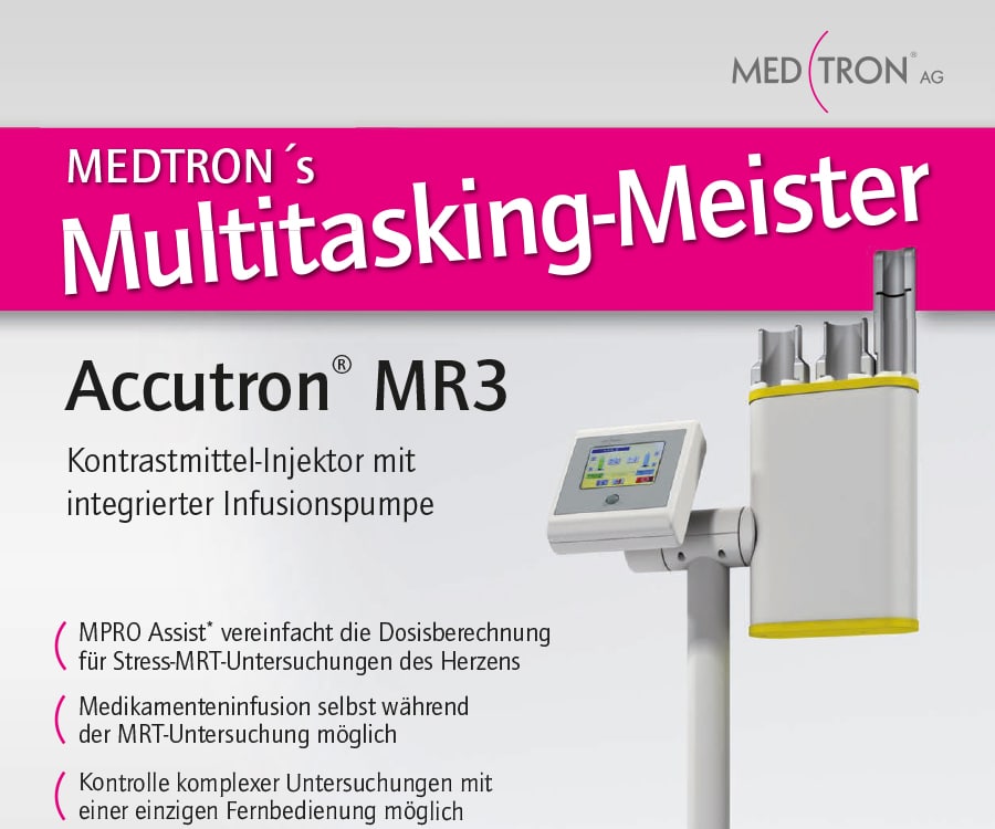 Der Accutron® MR3 ist ein Kontrastmittelinjektor, der neben den beiden Injektionskolben für Kontrastmittel und Kochsalzlösung über einen dritten Kolben speziell für die Infusion von Flüssigkeiten während der Bildgebung verfügt. Die Accutron® MR3-Doppelkolben sind für die präzise Injektion von Kontrastmitteln und Kochsalzlösung in der klinischen MRT-Bildgebung einschließlich Pädiatrie, Angiographie, Neuro- und Mammographie sowie für andere MRT-Routineuntersuchungen entwickelt. Die dedizierte Infusionspumpe hingegen ist für die langsame Abgabe zusätzlicher Medikamente vorgesehen, die bei spezifischen MRT-Untersuchungen erforderlich sind. Dazu gehören herzspezifische Medikamente für kardiale Stresstests oder Arzneimittel zur Schmerzkontrolle sowie zur leichten Sedierung, um den Patienten beim MRT-Scan zu unterstützen.